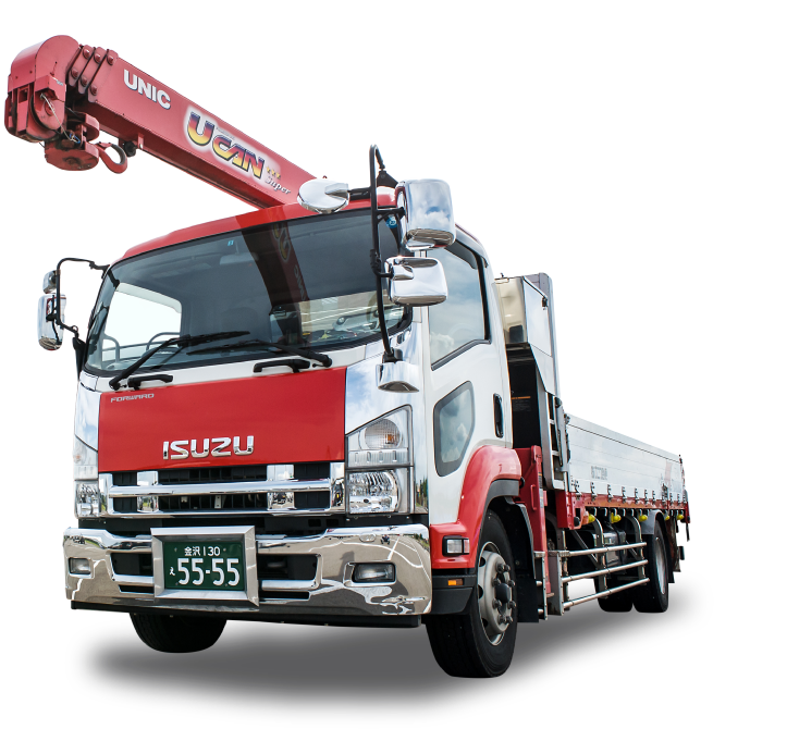 クレーンを装備したトラックで、360度回転のアームで、建築資材など重量物の積載運搬に使われています。