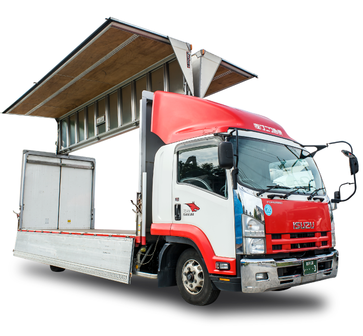 荷物室の側面から天井部分までを羽のように跳ね上げ、側面からの積み下ろしが容易なトラックです。